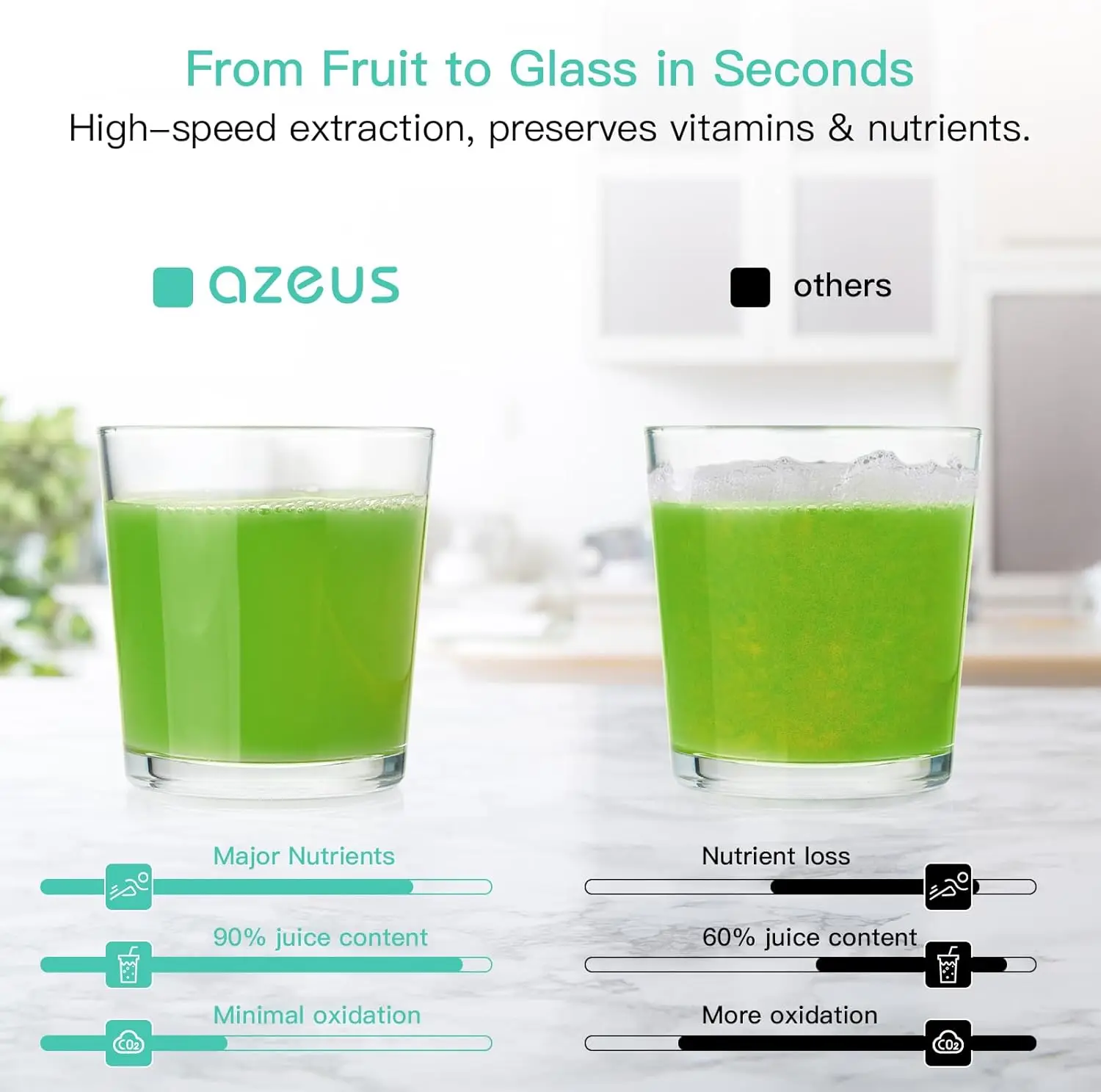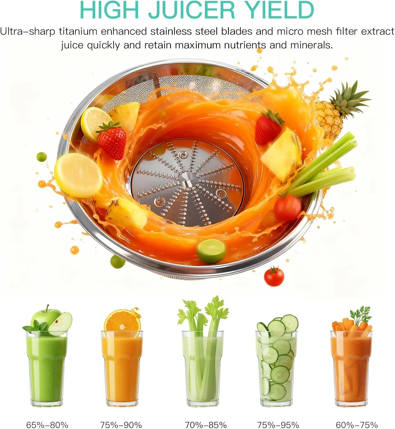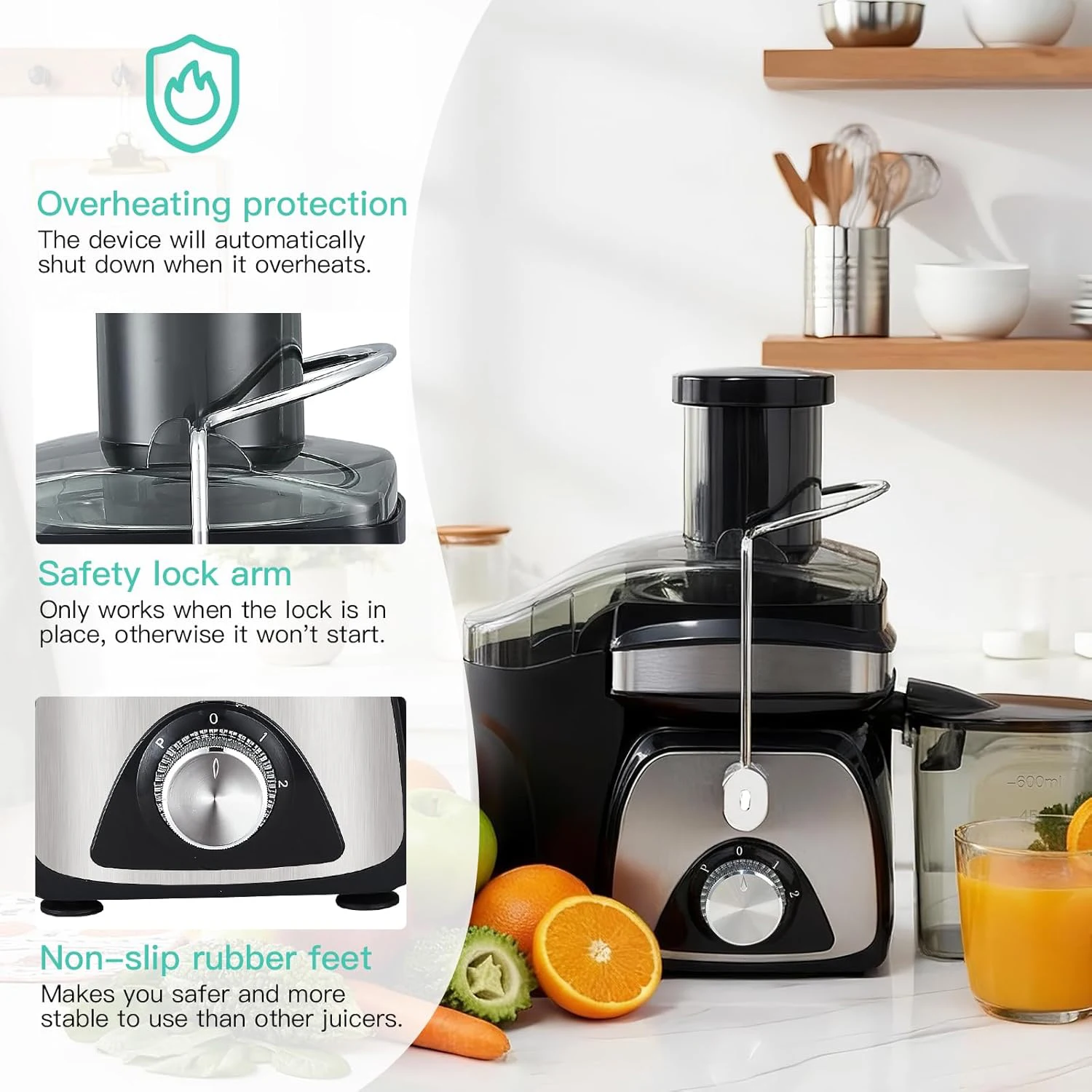 • 600W power, 18000 RPM, quiet motor with automatic pulp ejection