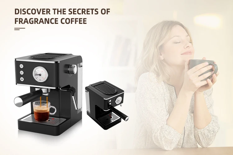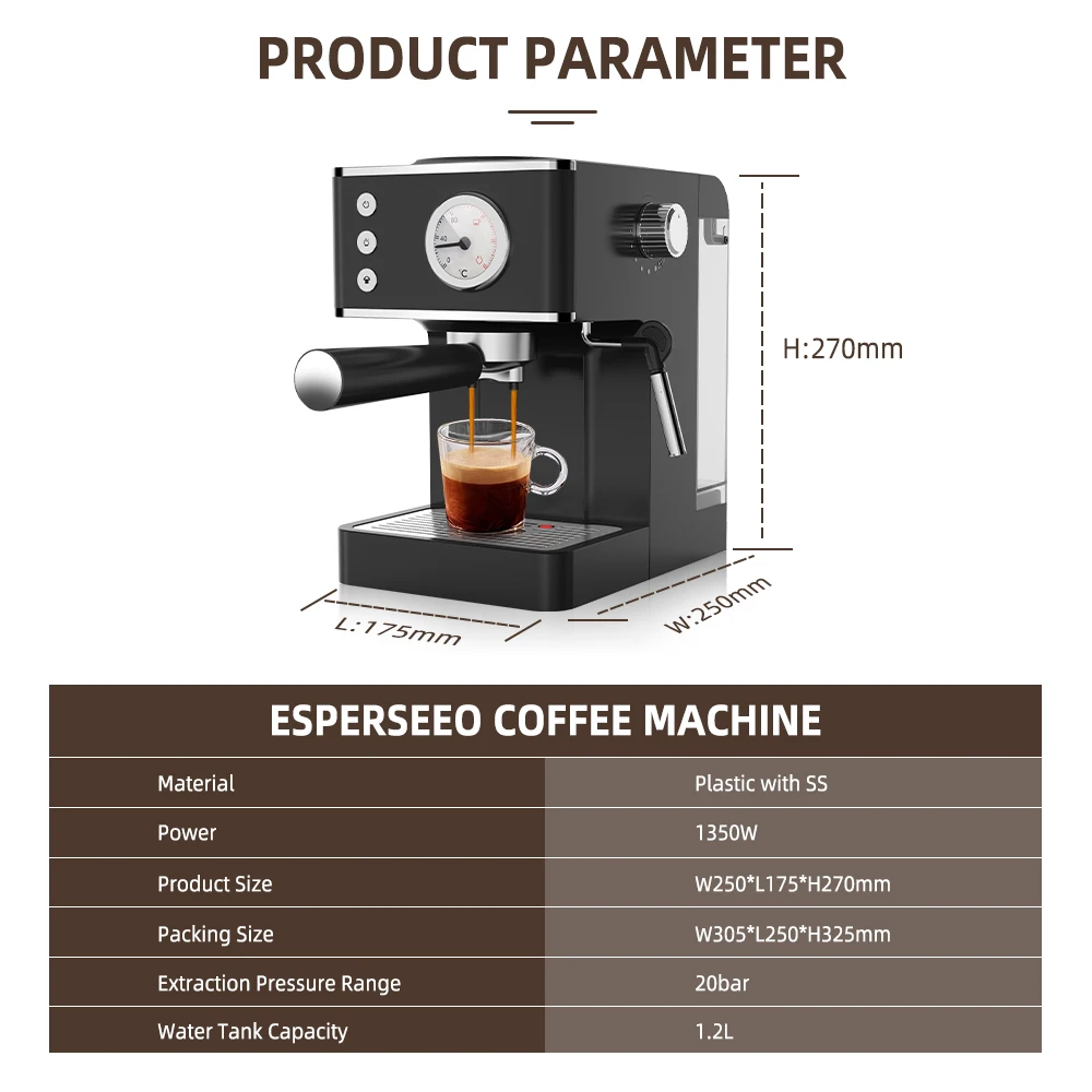 QF-EM301 pressure coffee machine 1. 220-240V ~ 50/60Hz, 1350W 2. Stainless steel decorative plastic body 3. 20 bar high pressure Italian pump 4. Can make espresso and cappuccino coffee 5. 1.2L detachable water tank 6. Removable foaming nozzle and drip tray for easy cleaning 7. With overheating and overpressure protection device 8. With printed circuit board control and digital buttons 9. Four buttons for one cup, two cups, on/off switch, hot water and steam functions.
