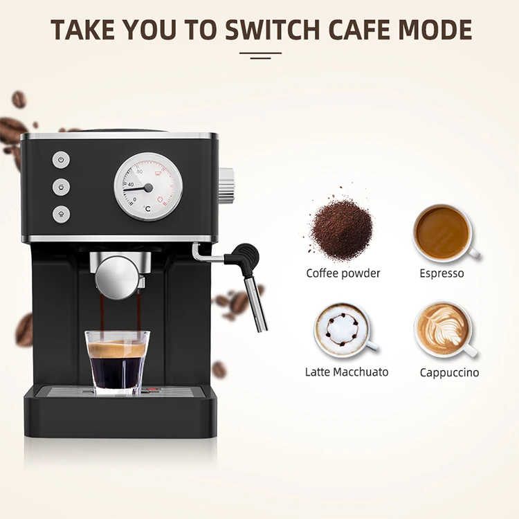 220-240V ~ 50/60Hz, 1350W, 20 bar high pressure Italian pump, can make espresso and cappuccino, 1.2L removable water tank with safety valve to automatically release pressure, removable frothing nozzle and drip tray, Easy to clean with printed circuit board controls and digital buttons