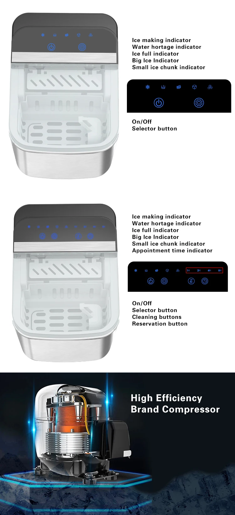 | Advantage 2 | Small ice, big ice both Ok| High Efficiency Brand Compressor | |||