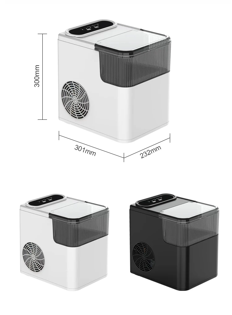 • Powered by 80W electricity with a 1.4L water tank, it uses bottled water and finishes one ice cycle in 6 to 8 minutes.