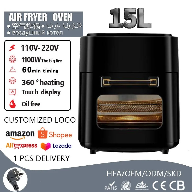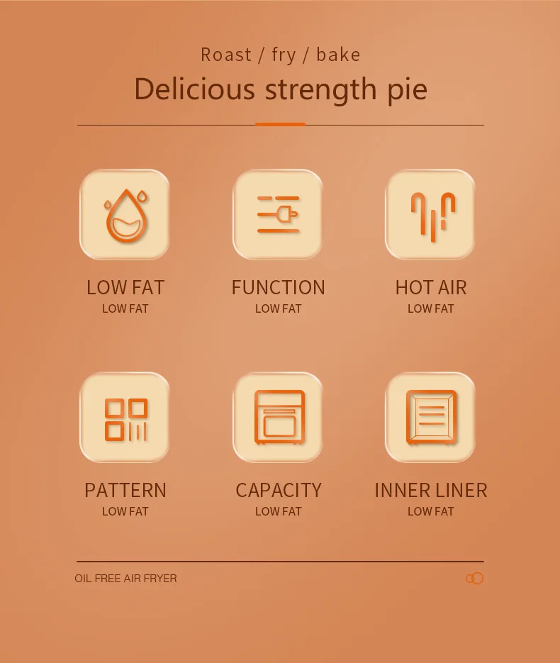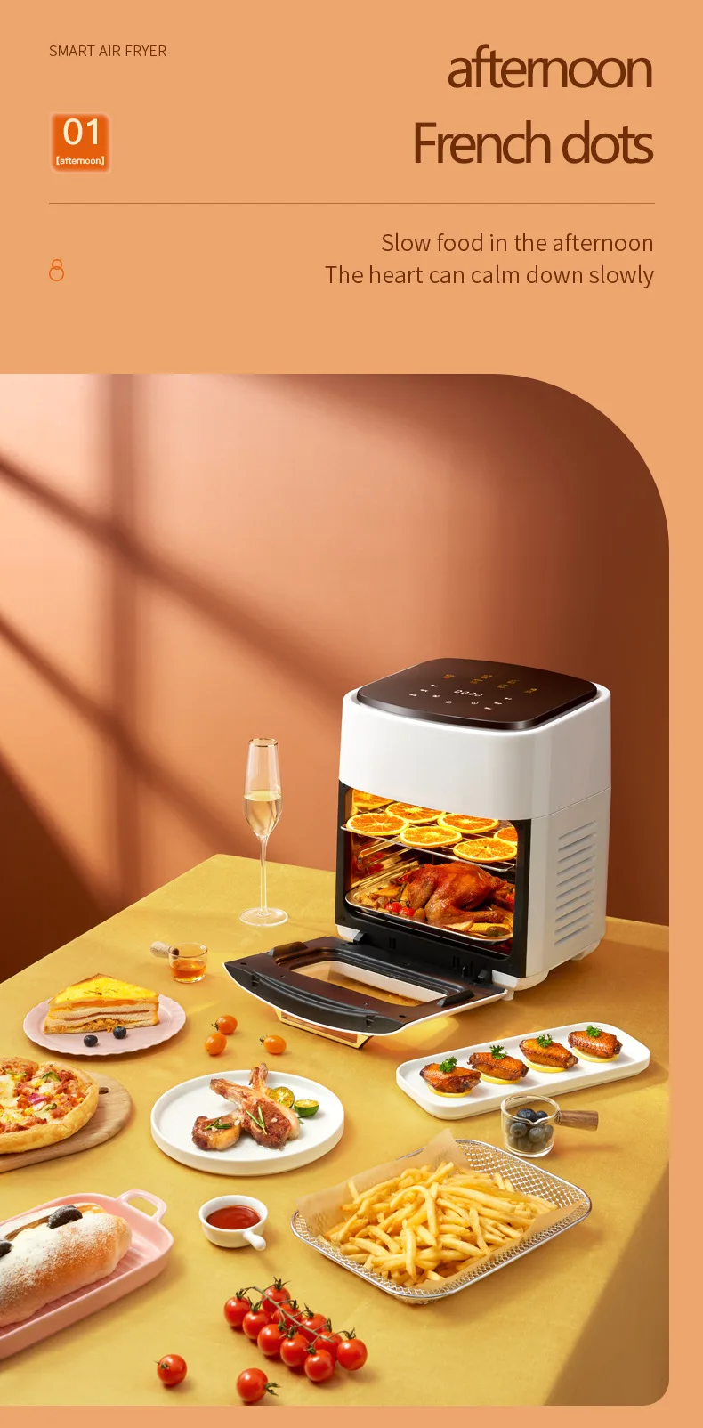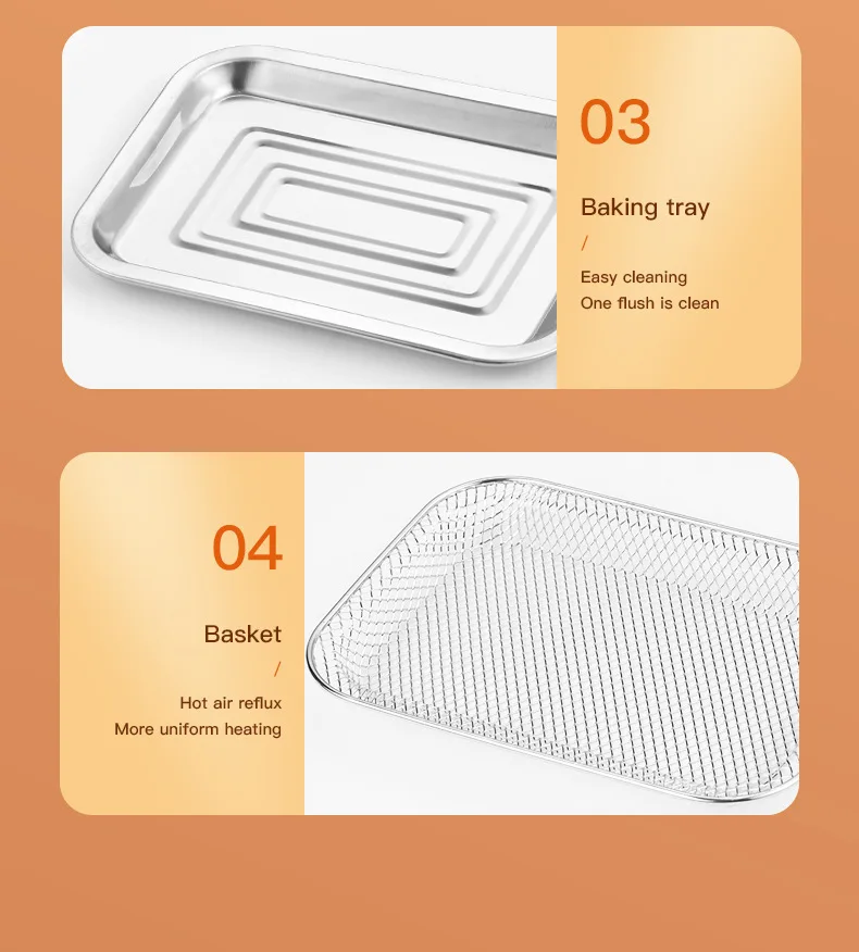 Plug: European/British/American/domestic three plug Control mode: microcomputer Heating mode: electric heating tube+hot air convection Material: PP shell+stainless steel heating tube+stainless steel liner Color: white/black/blue Timing: 0-3600minut Temperature: 180-220 ° C Basket: "Plating 270*200*40MM" Grilling net: "Plating 270*200*40MM" Oil pan: "410 material 262*193*30MM" Handle clip: "Plating 191*52*40MM"