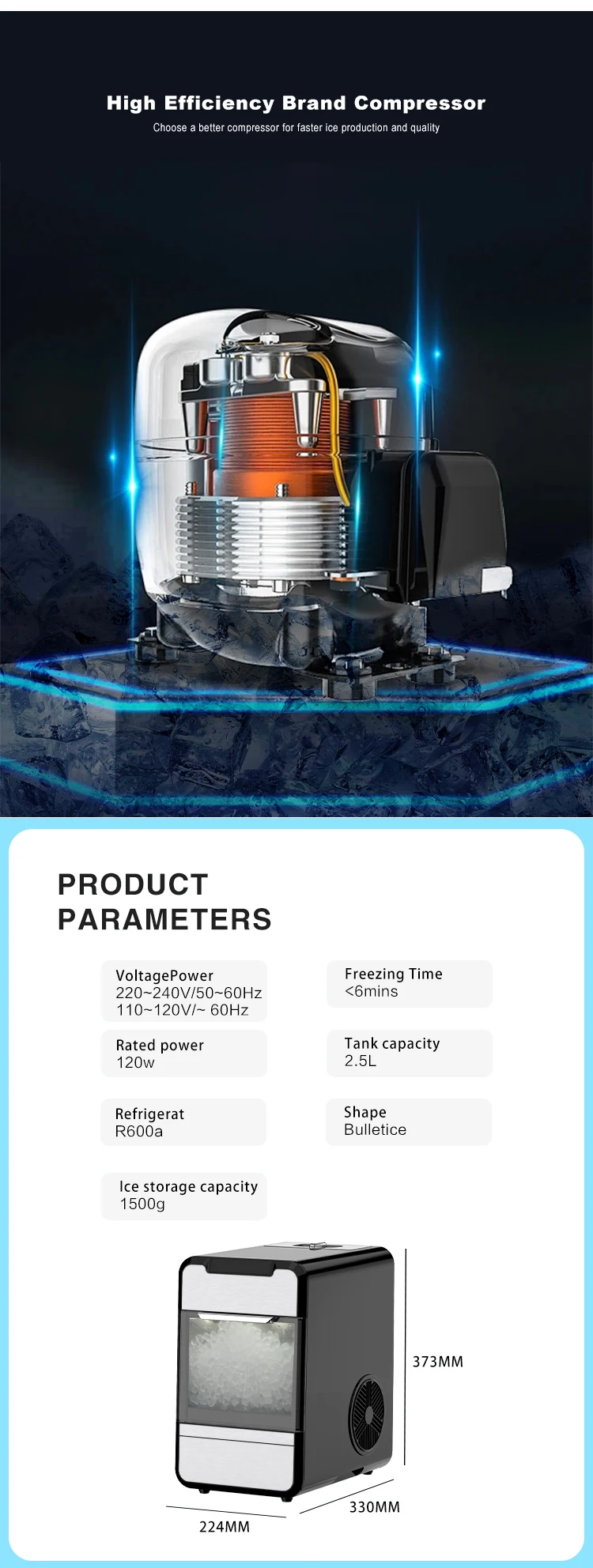 | Advantage 2 | Small ice, big ice both Ok| High Efficiency Brand Compressor | |||