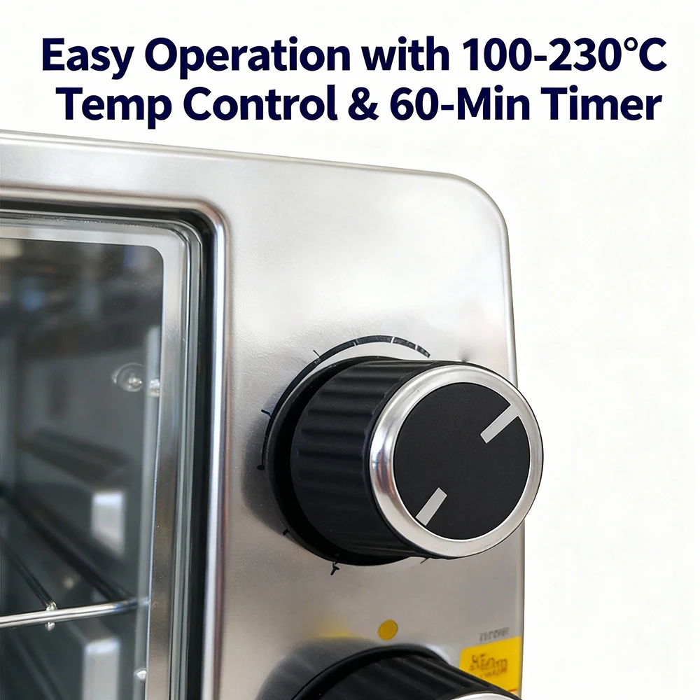 No complicated settings! Adjust the temperature from 100°C to 230°C to suit different recipes, and set the 60-minute timer with an end bell—you’ll get a clear alert when your food is ready. The power indicator light lets you check the working status at a glance, perfect for beginners and busy users.
